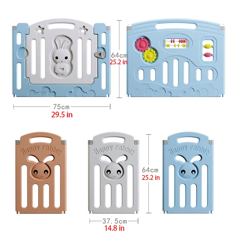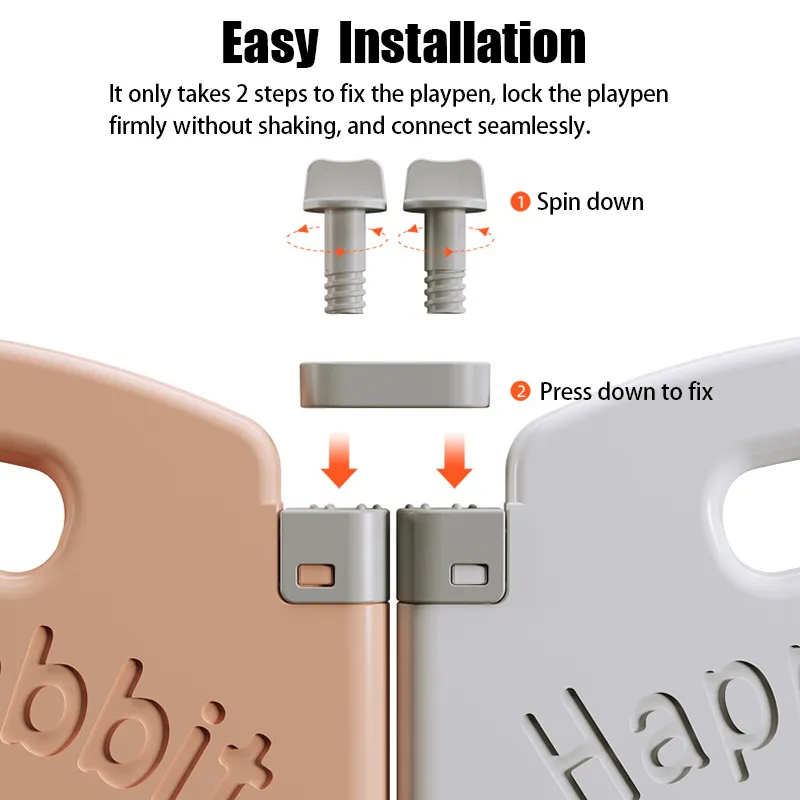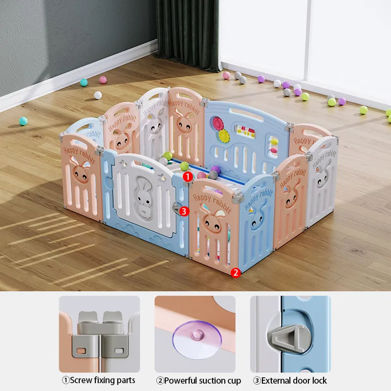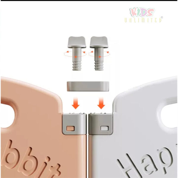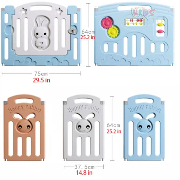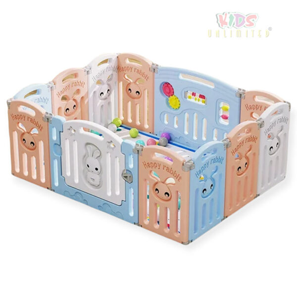 12 panel Happy Rabbit play pen offers parents a safe convenient solution for baby care and play. Swinging hinged door with safety lock ensures your child is safe. The size of this playpen can increase or decrease by removing or adding panels. Includes rubber suction cups to secure playpen to floor on flat/hard surfaces.