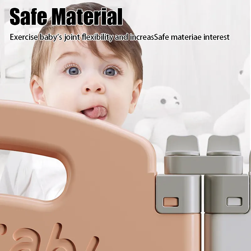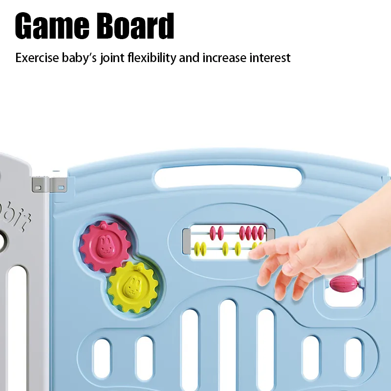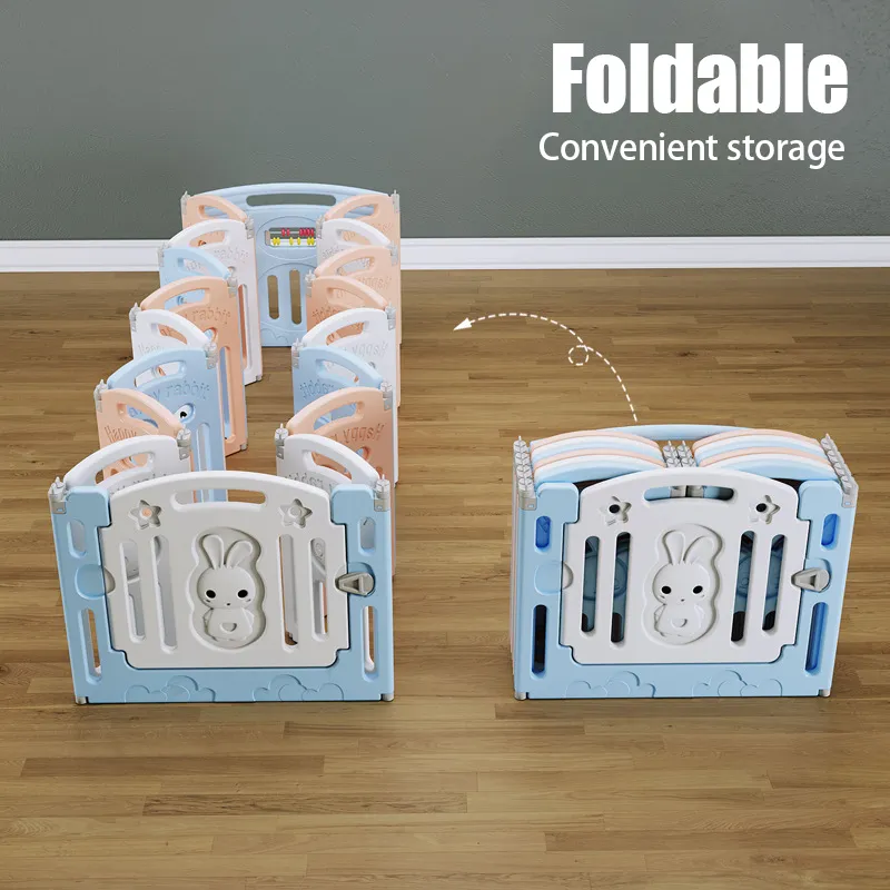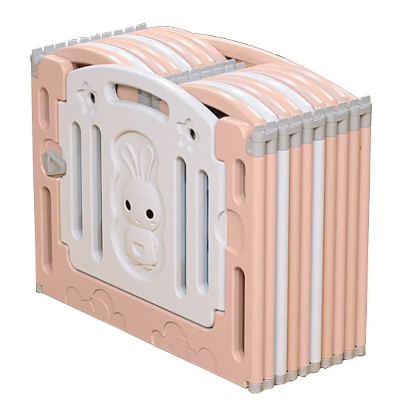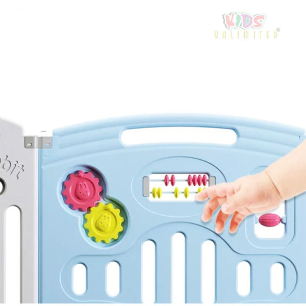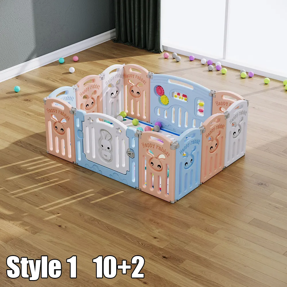 12 panel Happy Rabbit play pen offers parents a safe convenient solution for baby care and play. Swinging hinged door with safety lock ensures your child is safe. The size of this playpen can increase or decrease by removing or adding panels. Includes rubber suction cups to secure playpen to floor on flat/hard surfaces.