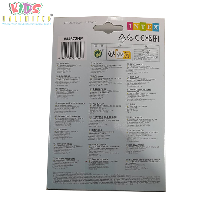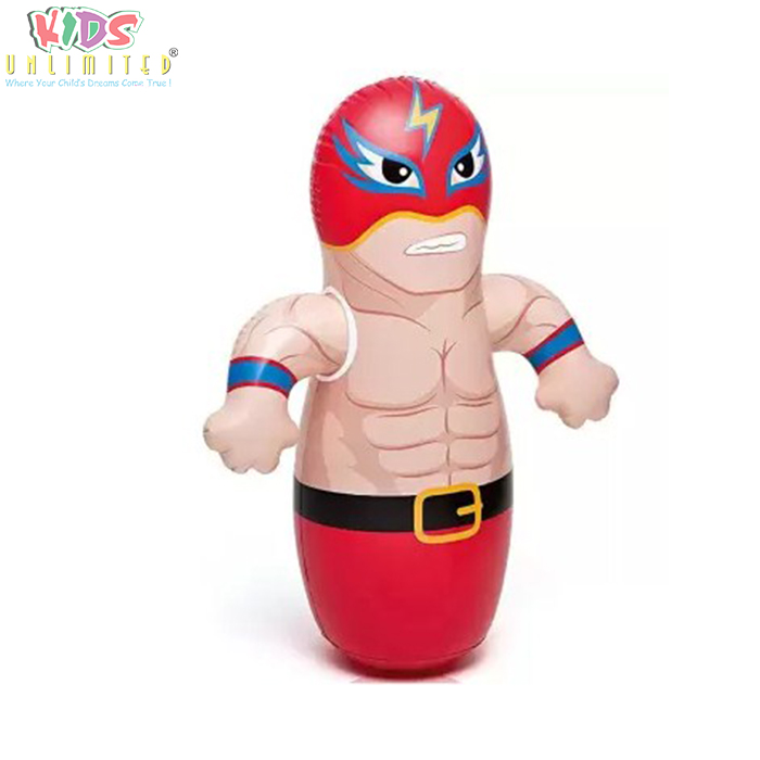 Durable 0.20mm vinyl with 0.30mm water-weighted base • Water-weighted base that keeps all the bop bags in place when they are hit over and over again • Air-inflated for soft, safe fun, bounces back fast • Size : 91cm x 51cm • Recommended Age: 3 years and above. Comes with a Double quick Hand Pump convenient to inflate.