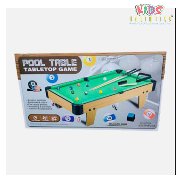Includes pool table, 15 colored balls, 1 cue ball, 2 pool sticks