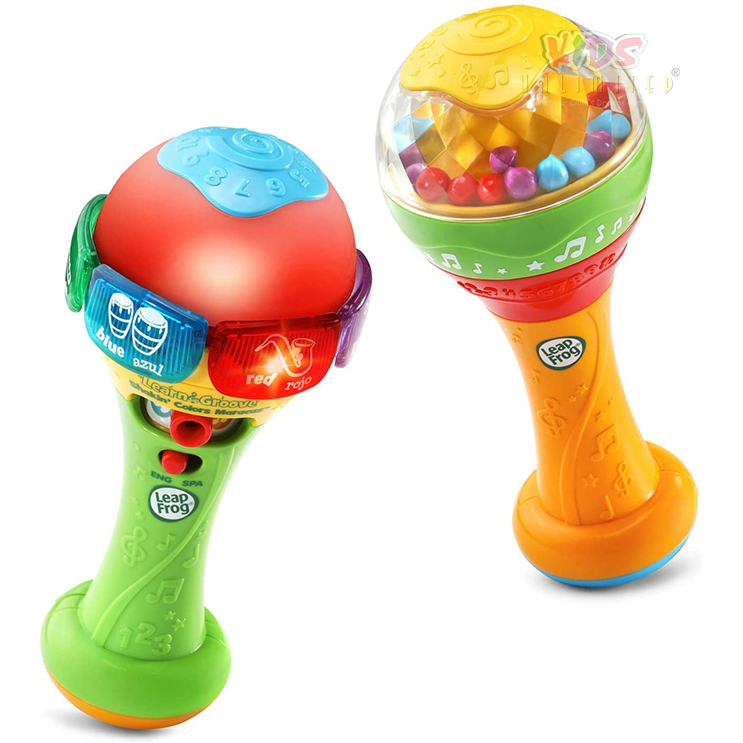 The electronic maraca features a light-up dome that changes colors with the music and plays sound effects; the other includes colorful shaker beads