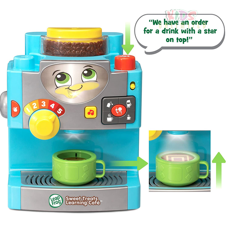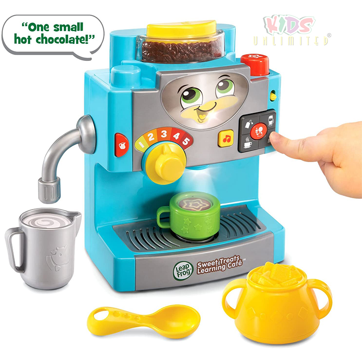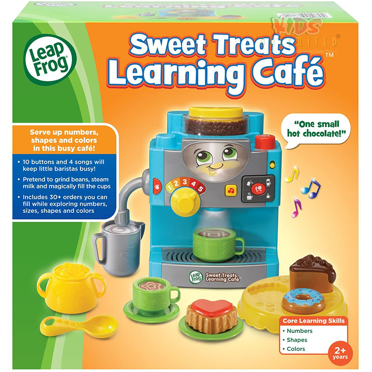 Serve up tasty looking drinks and pastries with a smile as you run your own shop with the Sweet Treats Learning Caf? Online Exclusive by LeapFrog! This cute caf? features a coffee machine that lets you pretend to grind beans, steam milk and fill the coffee cups.