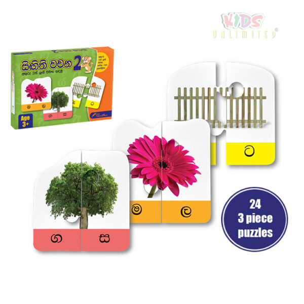 Panther Singithi wachana 3 is a simple word building exercise once the child has been introduced to the Sinhala alphabet, they would proceed to construct simple 3 letter words. The words chosen for this box consist of only simple Sinhala letters. The child is given a hint where the image of the word is displayed at the top of the puzzle and the words is printed in black on a unique color band to ensure the exercise doesn�t become complicating and frustrating for the child. The box consists of 24 sets of words, where each puzzle has 3 letters each. The size of a puzzle is apporx 85mm x 85mm . This educational toy has been developed to ensure that this product is available for children in all income groups. And some school have listed this item on their book list.