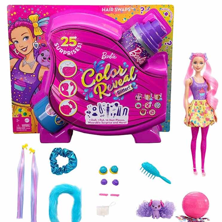 ​With 25 surprises, Barbie Color Reveal Glitter! Hair Swaps set delivers the ultimate unboxing experience with a glitter reveal, color-change transformations and 10 plug-in hair pieces for different looks!