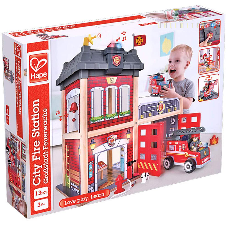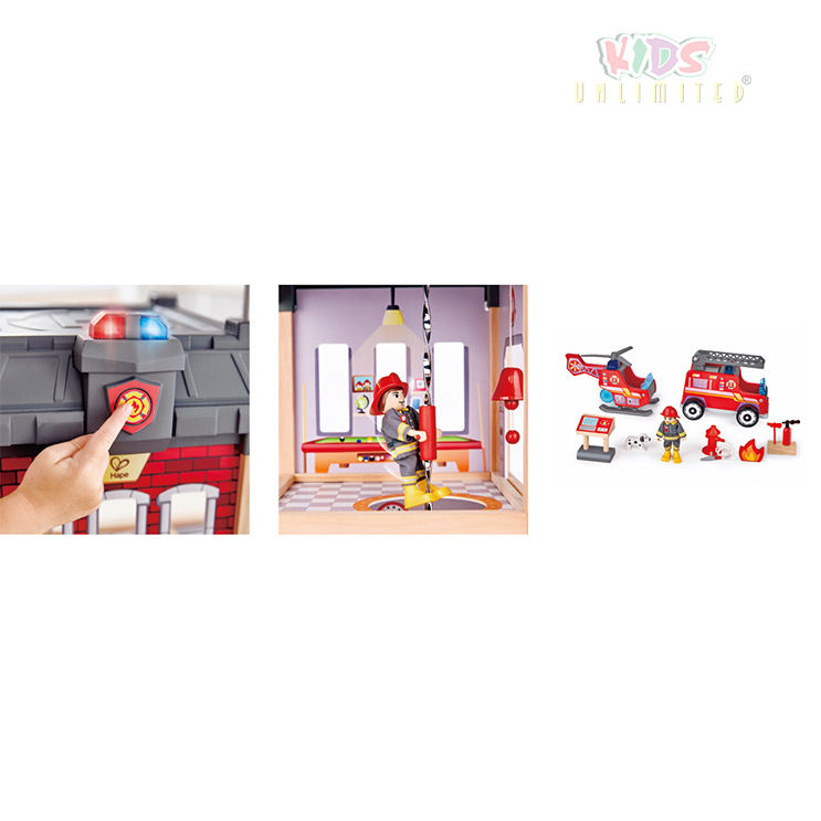 Clang-clang-clang! The alarm is ringing and flashing – there is a fire to put out. Button-activated sound and light effects add fun and realism to play scenarios. Requires 2xAAA batteries (not included).