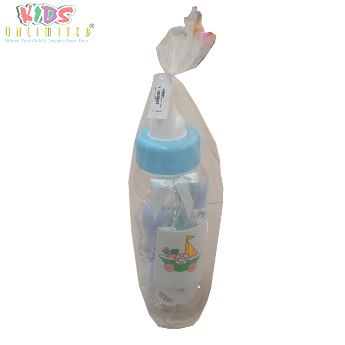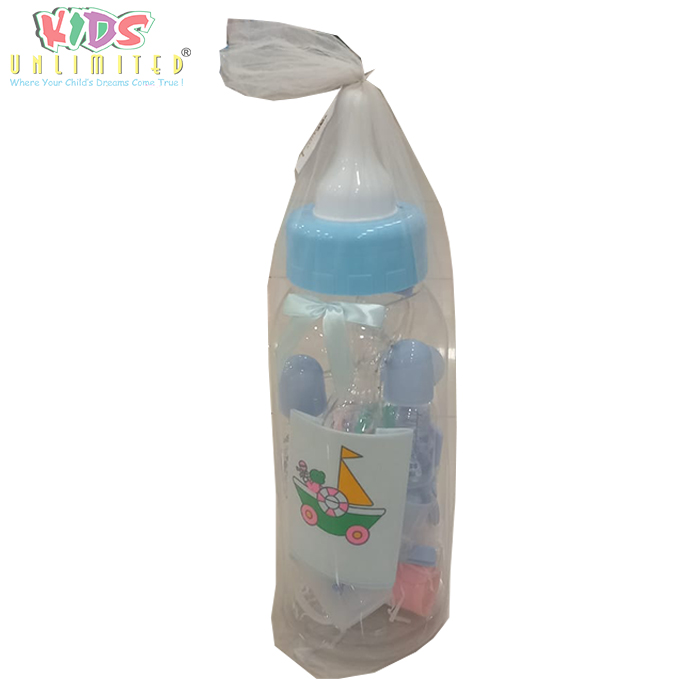 This giant baby bottle bank is sure to make an interesting and conversational gift at any parent-to-be’s baby shower. The cap is removable and this gift filled bottle is packed with many starter items such as snack cups, bottles, bibs and more. Standing 22 inches high and 7 inches wide. There are two colors to choose from, pink and blue.