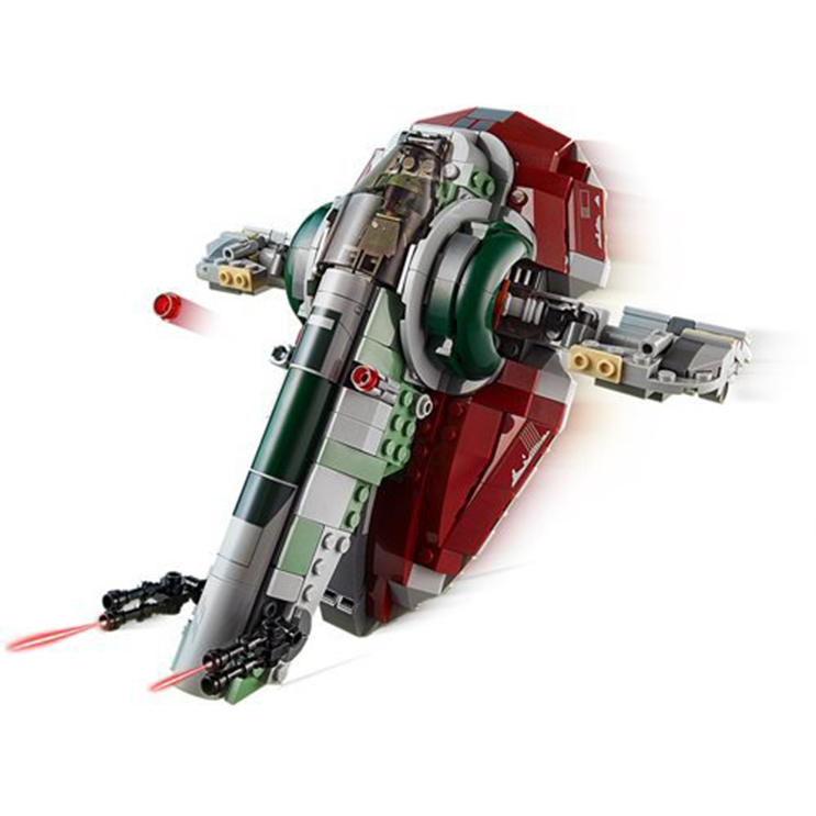 The starship has a handle for easy flying, an opening LEGO? minifigure cockpit, rotating wings, 2 stud shooters, 2 rotating dual blaster cannons (non-shooting) and a compartment for a Carbonite brick.