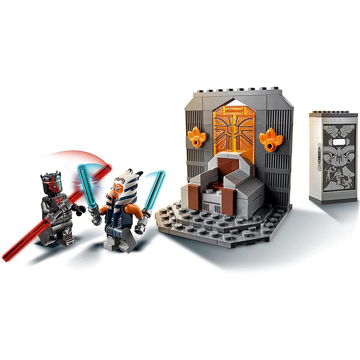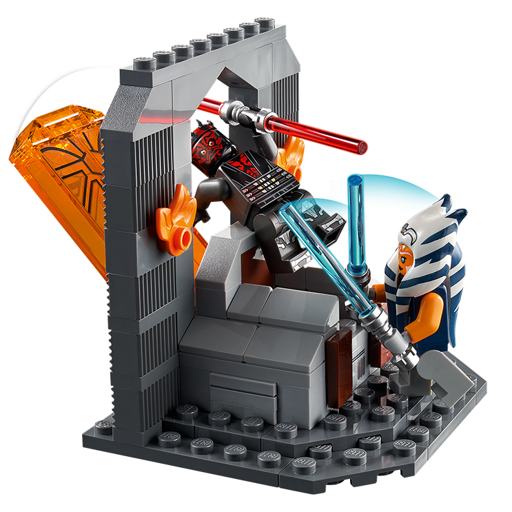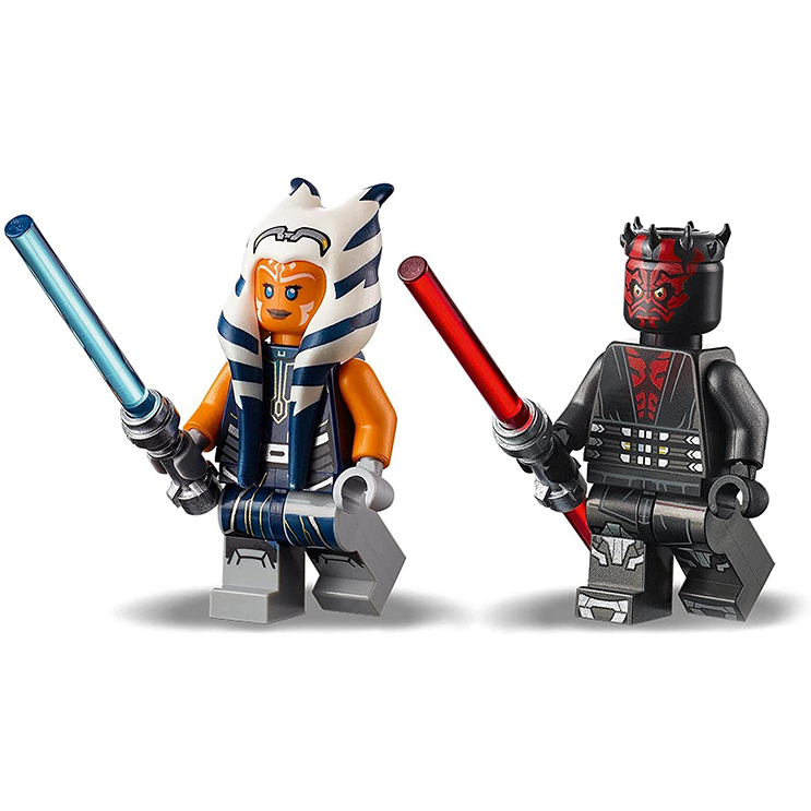 Includes 2 LEGO? minifigures: Ahsoka Tano with 2 lightsabers and Darth Maul with a double-bladed lightsaber to play out battles.