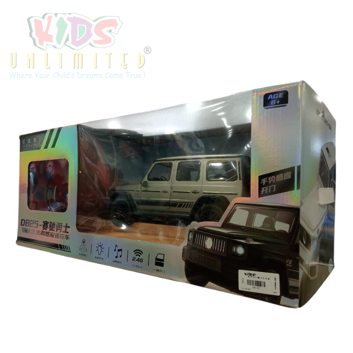 Explore the DB25-赛驰勇士 RC Car, a detailed 1:14 scale Mercedes-Benz G-Wagon replica. This remote control SUV boasts a 2.4G control system and exciting gesture sensing technology to open doors and control movement. Featuring realistic lights and sounds, this durable off-road vehicle is perfect for immersive play and a great gift for ages 8+.