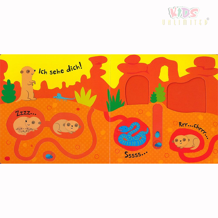 An engaging board book for very young children, with sliding panels to reveal secret images hiding below. Babies will love moving the sliders to make a bush baby peer out from his tree trunk home, meerkats pop up from their underground burrows and a monkey swing through the trees. Brilliant for developing essential motor skills and hand-eye coordination and full of vivid colours, stylish illustrations and friendly animals.